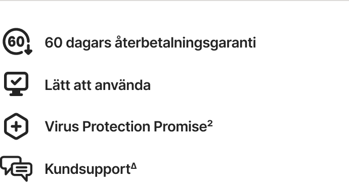 2 Begränsningar gäller. Du måste ha en prenumeration med automatisk förnyelse på enhetssäkerhet med antivirus för virusborttagningstjänsten. Se Norton.com/virus-protection-promise för fullständig information.